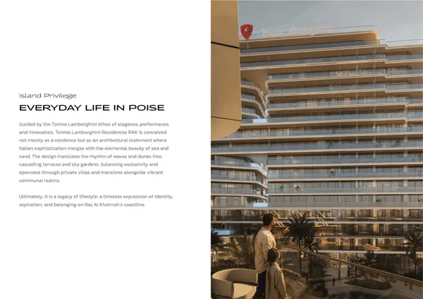 Tonino Lamborghini Residences’ elevation draws a sculpted coastal profile; its cascading terraces and sky gardens are tuned to the island’s prevailing winds and tidal rhythms. A contemporary yet enduring language guides every line: assertive forms moderated by tactile, natural textures and discreet metallic accents refined by Tonino Lamborghini’s iconic lines and elements. Terraces are carefully proportioned to maintain views, provide shade along the promenades, and soften natural light. Native planting blends the architecture with the shoreline's ecosystem, while the landmark's form ensures privacy and a sense of calm. Altogether, the composition harmonizes luxury with nature, projecting quiet confidence and timeless poise along Al Marjan.